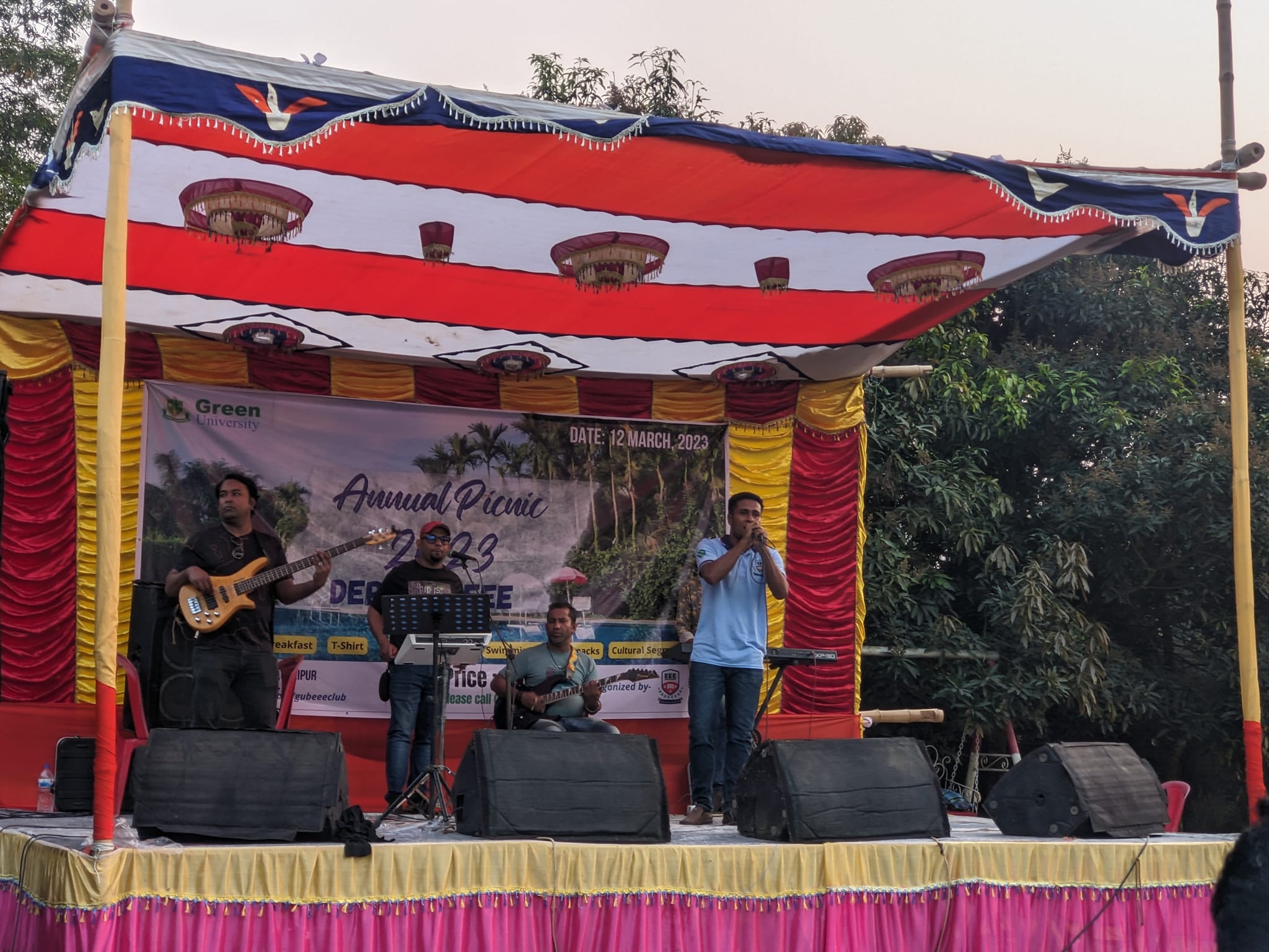 At 2 PM, lunch was served. Everyone enjoyed the food so much. The food was so delicious. Then the leadership award-giving ceremony started. The leadership award was given to the outstanding leaders of the EEE club, Mentors of the EEE department, and interns of EEE-Green. Then the cultural segment started. A Band named “গানসৈনিক” was hired for this event. Everyone enjoyed the segment. One of our faculty Takvir Anam performed a famous song for the audience. The students of the EEE department also performed various songs in this segment. Then the prize-giving ceremony was held. A raffle draw was arranged. It was a dramatic segment and everyone enjoyed this event so much. Our honorable treasurer of Green University, Prof. Dr. Md. Fayzur Rahman sir shared some words for students about the picnic. Then, Dr. ASM Shihavuddin sir delivered his speech among the participants. This is how we wrapped up an amazing experience and headed to our university again.