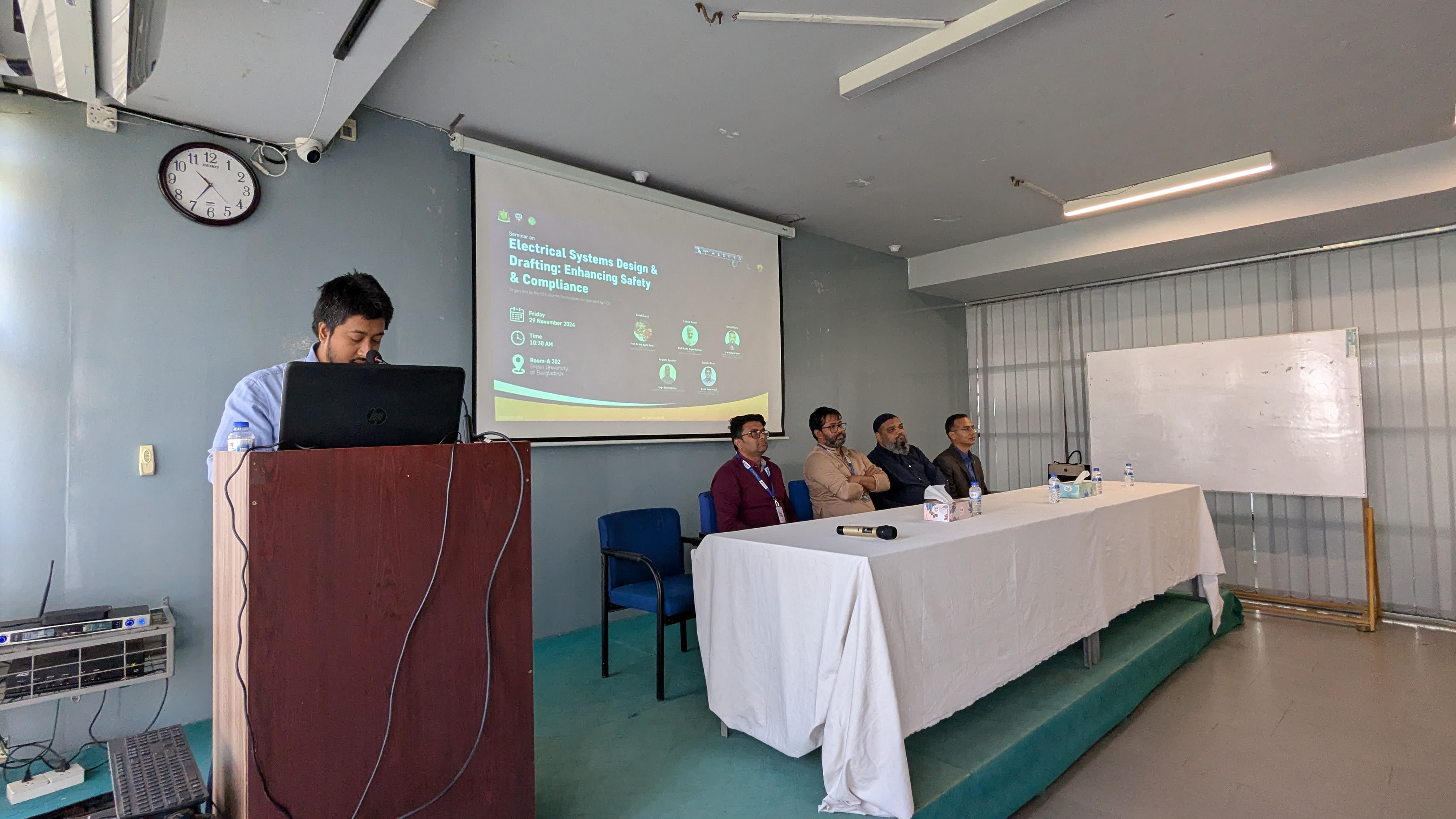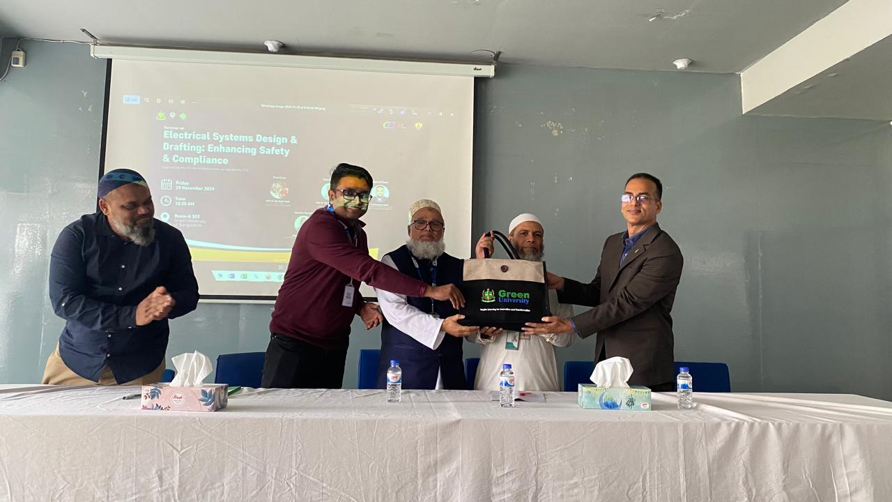 I am pleased to inform you that the seminar on "Electrical Systems Design & Drafting: Enhancing Safety & Compliance," organized by the EEE Alumni Association in collaboration with the Center for Career Development (CCD), has been successfully held today, 29th November 2024, at Seminar Room A-302, Green University of Bangladesh.