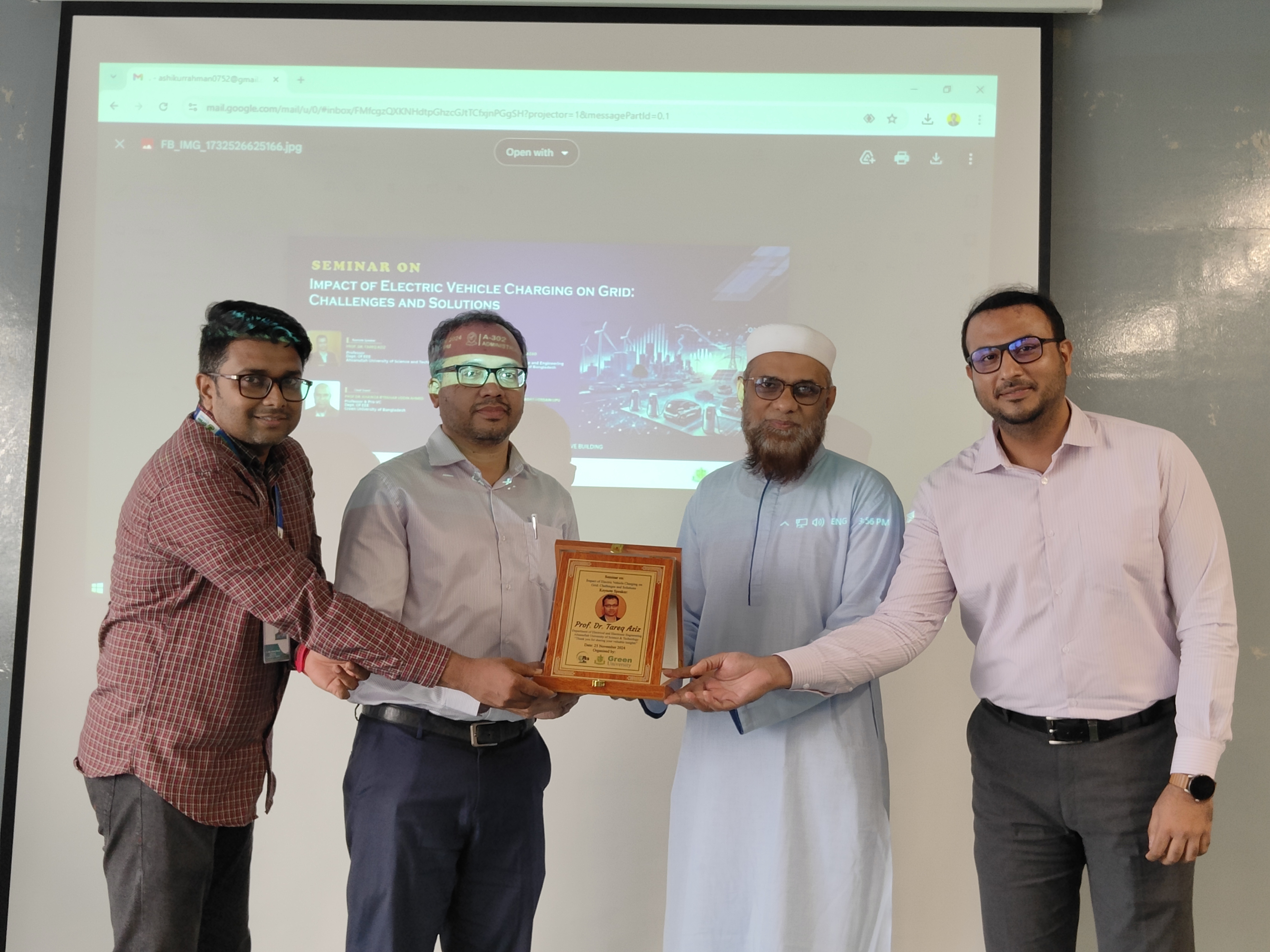 The keynote speaker, Prof. Dr. Tarek Aziz, delivered an insightful presentation on the challenges and solutions related to electric vehicle charging and its impact on the power grid. The seminar was well-attended by faculty members and students alike, generating fruitful discussions and knowledge sharing.