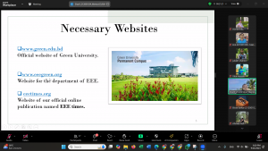The primary focus of the program was to introduce new students to various university resources starting with the GUB Student Profile. Mentors explained how students can use this profile to check their class routine, bill history, and results. This was followed by an introduction to the official Green University website where students can access notices, the academic calendar, the syllabus, and resources for various departments. The mentors also discussed how to explore the websites of other departments and introduced the official EEE Green website, explaining how students can check faculty profiles, faculty schedules and other important departmental information.